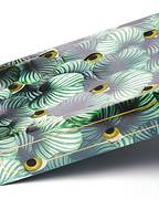 Pack e cosmetico dall’effetto stratosferico. Il set continua con i due piccoli pack in cartotecnica che riprendono il design tropicale sui toni del verde e del fucsia. Le scritte dorate sono il focus dei pack e sono frutto di un oro stampato con un rilievo a caldo che presenta delle texture ottenute con clichè hinderer + mühlich.