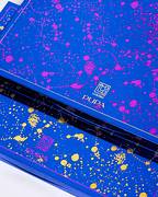 La base blu presenta una sovrastampa in due versioni, una dorata e una fucsia, in cui i cliché microincisi hinderer + mühlich riproducono la superficie lunare sul blush e le costellazioni sulla trousse, un risultato perfetto e preciso dalla qualità unica.