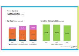 Uno sguardo finale al fatturato complessivo del comparto: il segmento Cut Sheet colore è il segmento che porta maggior fatturato, ed è rimasto stabile rispetto al 2023. Buono l’incremento di fatturato del bobina a colore, passato da una share del 10% a una share del 30%.